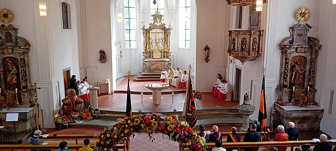 Mit Bannern und Fahne ging es zur Bodnegger Kirche, in der ein feierlicher Erntedank- und Festgottesdienst mit Diözesanpräses Walter Humm und Präses Pfarrer Störzer gefeiert wurde.