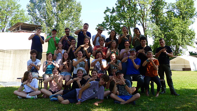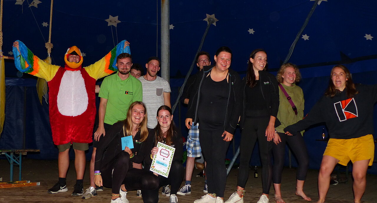 Unter dem Motto „Welcome to the KJungle“ wurde ein abwechslungsreiches Programm auf die Beine gestellt. Affen, Schlangen, Elefanten, Tiger und Tukane traten das ganze Wochenende gegeneinander an. Am Freitagabend gab es ein Nacht-Geocaching mit anschließendem, gemütlichem Lagerfeuer. Nach einer gewittrigen Nacht mussten am Samstag die Tiergruppen ihre Teamfähigkeit beweisen. An verschiedenen Stationen wurde Stärke, Kreativität, Standhaftigkeit und Vertrauen getestet. So musste man beispielsweise als letzte Person in einer Bubble stehen oder ein Auto so schnell wie möglich ins Ziel ziehen. Mittags gab es verschiedene Workshops, bei denen besonders Jugger wieder hoch im Kurs war. Bei dem heißen Wetter durfte auch eine ausgiebige Wasserschlacht mit selbstgemachten Wasserbomben nicht fehlen. Am Abend war es Zeit für die große Zirkusshow, denn das Finale des Verbandspiels 2021/22 stand an. Mit großartigen Beiträgen der KJ Schorndorf und der KJ Schwendi wurde der Abend richtig bunt. Auch die Tiergruppen des JUFE durften ihre Talente zeigen. Nach der Siegerehrung ging es zur After-Show-Party im Zirkuszelt und am Lagerfeuer über. Ein Gottesdienst am Sonntag bildete den gemeinsamen Abschluss. Hierbei haben wir uns überlegt, was wir besonders gut können und dann mit bunten Holy-Farben ein Pride-Plakat gestaltet.