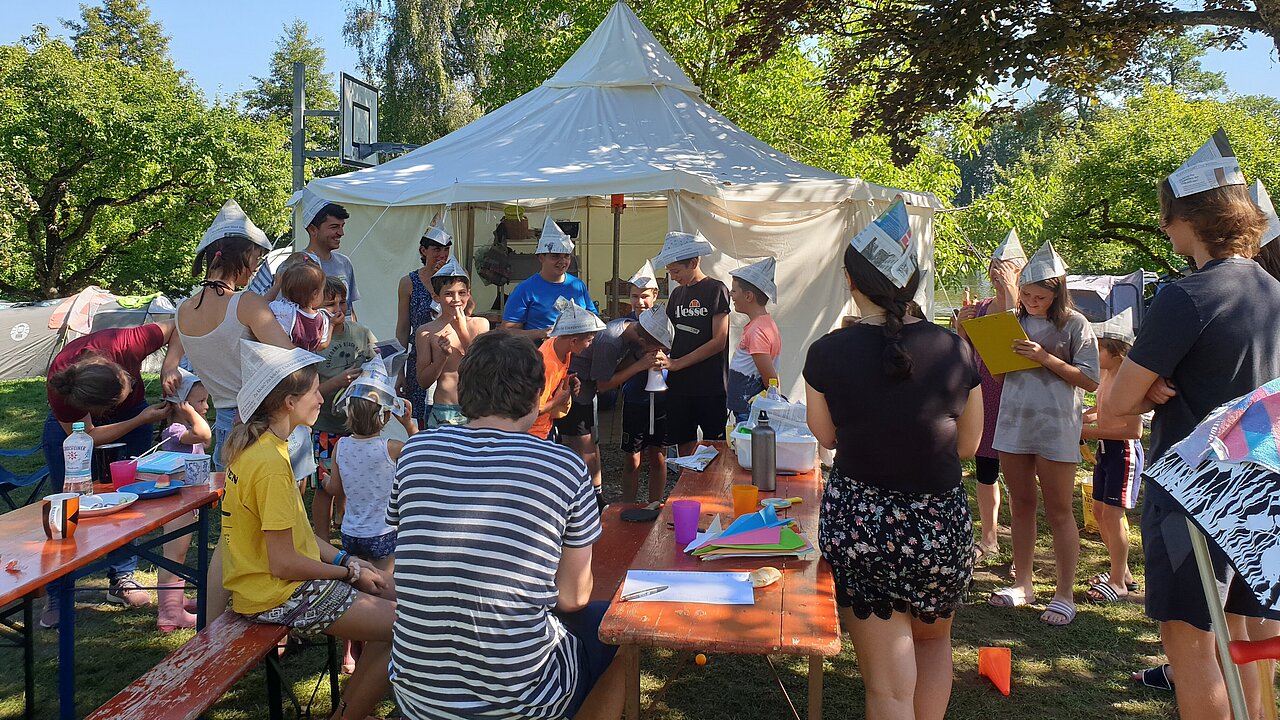 Ein festes Tagesprogramm gab es nicht. Trotzdem wurde es kreativ, indem die ein oder anderen Stoffwimpel bunt wurden. Am Donnerstagnachmittag kam der DAK zur 72-Minuten-Challenge zu Besuch. Knapp 20 Jugendliche und Kinder (teilweise auch mit Eltern) mussten innerhalb der vorgeschriebenen Zeit insgesamt 25 Aufgaben meistern. Die Aufgaben waren vielfältig: Papierfliegerbau, Brücken und Tunnel im Sand bauen, ein Gummihuhn aus dem See fischen, über die Slackline balancieren, Gummistiefel organisieren, ein Schubkarrenrennen bewältigen und zum Schluss noch zwei Mammuts im Zeltlager einfangen.