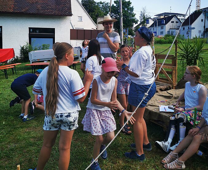 In der Woche darauf stoppte der DAK an einem großen Piratenschiff im Gemeindehausgarten in Schwendi. Hier stellten sich 23 Kinder und Jugendliche der Kolpingjugend Schwendi der Herausforderung. Wieder gab es 25 Aufgaben zu lösen. So bekamen die Leiter Heiratsanträge, die Kinder sangen zusammen ein Piratenlied, es wurden Papierflieger gebastelt und auch ihre sportliche Seite war gefragt, bei der sie uns mit Rädern und Purzelbäumen beeindruckten. Am Ende musste sich der DAK aber auch in Schwendi geschlagen geben.