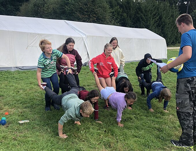 Los ging es bei der KJ Waldstetten, die jedes Jahr zu Ferienbeginn ein großes Zeltlager für Kinder zwischen neun und 15 Jahren veranstaltet. Dieses Jahr stand es unter dem Motto „Wickie und die starken Männer“. Mutig nahmen die 41 Teilnehmer*innen die Herausforderung an und stellten sich bei unserem Besuch der Wette gegen den DAK. Insgesamt 25 Aufgaben mussten innerhalb von 60 Minuten gelöst werden. Dazu gehörten Steintürme bauen, Elfmeter schießen, Frisuren machen oder Kleidung verkehrt herum anziehen… egal welche Aufgaben sie erwarteten, sie meisterten alle mit Bravour und der DAK musste sich geschlagen geben. Der Preis: eine Runde Eis für alle.