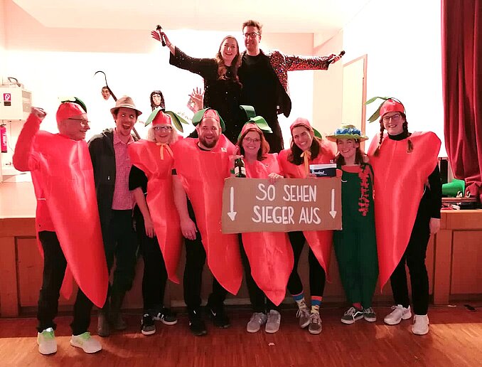 Die Kolpingkarotten der Kolpingsfamilie Ergenzingen gehörten zu den acht Vereinsteams, die sich in einer Challenge mit verschiedenen Herausforderungen bei der Vereinsfasnet am 17. Januar den Sieg erhofften. Bei den scheinbar einfachen vier Spielen „Schrille Post“ – für Nicht-Schwaben ein echtes Hörvergnügen, die „Reise nach Beschmusalem“, einem „Hindernislauf unter erschwerten Bedingungen“ sowie „Wer kann sich zehn Dinge merken?“ brauchte es körperliche und geistige Konzentration. Hier zeigten die neun Karotten, was in ihnen steckt, und meisterten die Herausforderungen mit Bravour. Wer mit so vielen Karottenvitaminen A, B, C und E gepaart mit wichtigen Mineralien antritt, hatte die besten Voraussetzungen für den Sieg geschaffen.