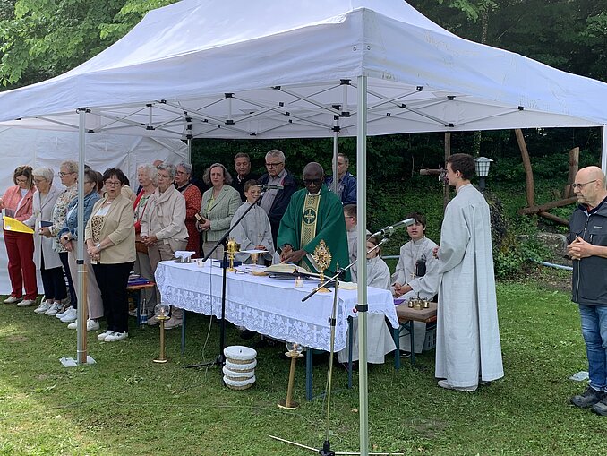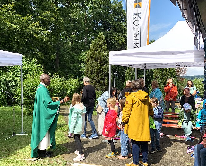 „Gott hat alle Kinder lieb“ war das Motto des gemeinsamen Gottesdienstes beim Auftakt vor der Kolpinghütte auf der Heide. Neben einer Vielzahl an Gästen waren vor allem viele Kinder gekommen, um gemeinsam mit Pfarrer Pius Nnunda die heilige Messe zu feiern. Nicole Koch-Pruneddu hatte mit dem Team aus Erzieherinnen und Kinderkirche das Thema sehr einfühlsam in die Feier mit eingebunden.